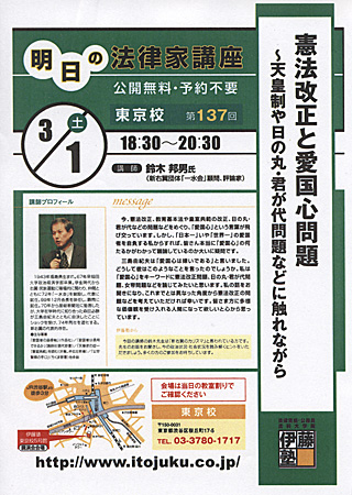 そんな主張は以前からしていた。教育基本法に「愛国心」を書く必要はない。「国を愛する態度」も入れる必要はない、と言ってきた。そしたら社民党衆院議員の保坂展人さんが、「じゃ、国会で参考人として出て下さいよ」と言う。いいですよ、と言った。楽しみにしていた。予習もした。でも、国会ではゆっくり審議もしないで、自民党は強行採決をしてしまった。私の出番もなかった。ガッカリした。
