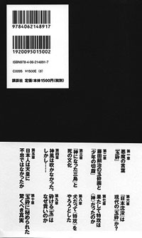 さて、本の帯の裏には「目次」が書かれています。「何だ!これは。許せん!」と手に取った愛国者の方々に、破り捨てられるのではないかと心配です。いっそのこと、帯の中に街宣車を描いてくれればよかったのに。街宣車で糾弾しようと思って本を手に取ったら、「あれっ、もう行ってるのか」と思って納得するでしょう。そんなことはないか。