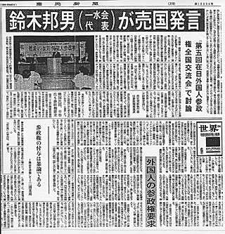 〈72年に一水会を結成以来、反原発など既成の右翼運動にとらわれない活動を続けてきた鈴木さんは「納税など住民としての義務を果たしている定住外国人にとって参政権は当然の権利。それを認めることが、日本人の民族意識を希薄にするとは思わない」とする。一水会の内部では、これに批判もあるが、「必要なのは右翼や左翼という看板でなく、個人の判断。組織は勉強する場として残ればいい」と鈴木さんは話している〉
