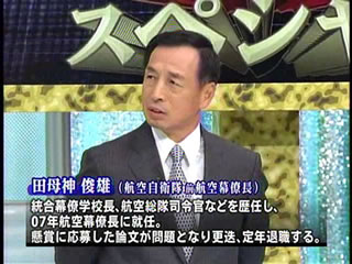 「たかじん」は毎週、金曜日に2時間収録し、日曜に1時間半に編集して放送する。30分は、ヤバイ所を切ってるんだろう。毎回、ゲストがいる。普通は1人だ。だが、11月28日(金)収録・30日(日)放送分は、3人もいた。この日は「国防スペシャル」で、これだけで1本の濃い内容だった。初めの方に田母神さん1人がゲストとして登場。途中から、もう2人加わる。松島悠佐さん(陸上自衛隊元中部方面総監)と川村純彦さん(海上自衛隊元海将補)だ。陸海空と「三軍」が揃ったのだ。